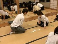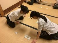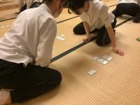 百人一首を読みあげる声につられて和室に入ると競技かるた部員たちが2人1組になり、札を取り合っていました。上の句が読みあげられた瞬間に目にも止まらぬ早さで手が動きます。大会は木曜、金曜日に文教会館で行われます。