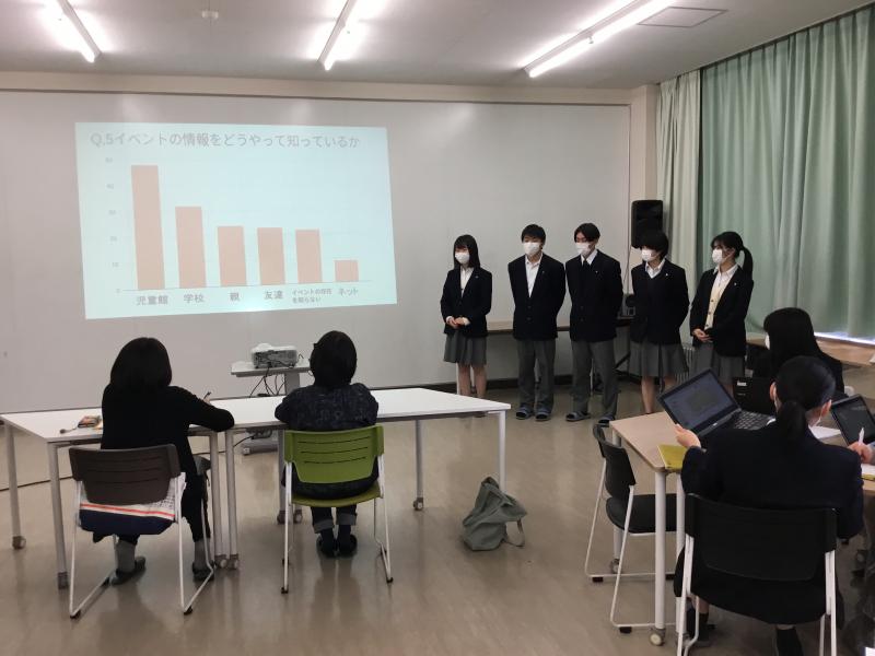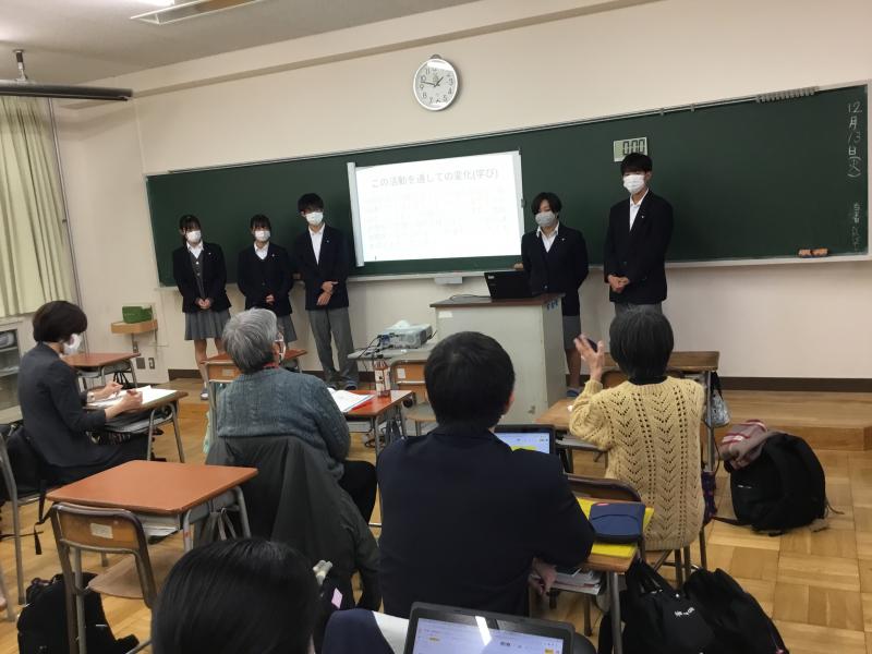 5人でチームを組み、「高校生と異世代との交流」や「防災意識向上への発信」などの自分たちが発見した課題について、解決策を発表しました。生徒たちは、用意したスライドを見せながら、5人が交代しながら発表しました。生徒は堂々と自分たちが考えたアイデアを発表していましたが、中には緊張している生徒もいて、的確に話することの難しさを改めて感じていたようです。