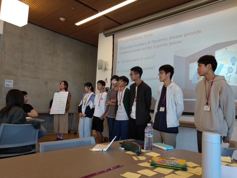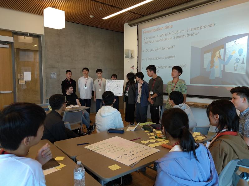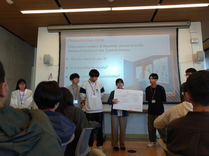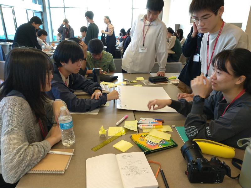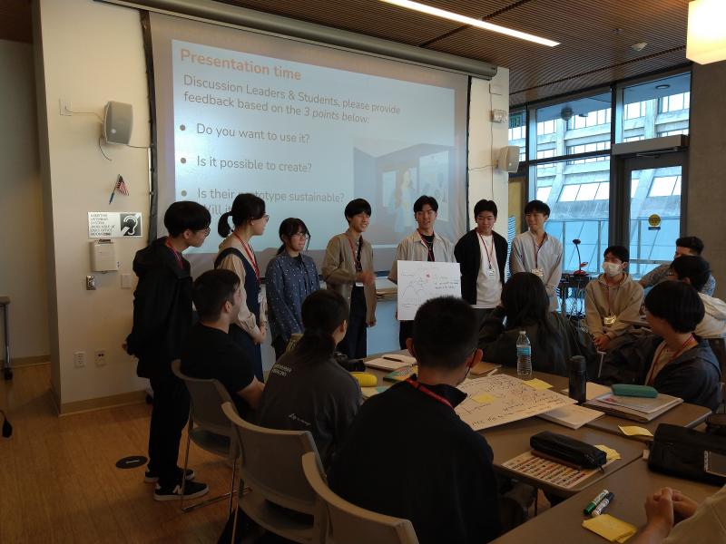 アイデアは試作段階なので色々な質問が上がります。発表後は、質疑応答をふまえてアイデアの改善点などを話し合いました。この一連の活動は「Design Thinking」と呼ばれるものです。