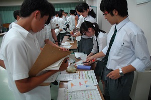 7月10日(月)に、サイエンス・イングリッシュⅠとAI課題研究Ⅱの中間発表会を開催しました。今回の発表会は、これまでの研究内容や研究経緯をまとめ、さらに議論して深めようという趣旨で行われ、研究経過のフローチャートに加え、参考文献や実験器具を展示したり、研究の様子を写真や動画で説明したりする班もありました。大学の先生方や留学生の皆さん、そして理数科1・3年生も参加し、活発に議論する様子が見られました。