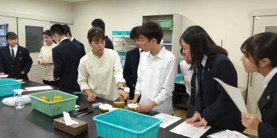 最初はNIMU(物質・材料研究機構)に関するセミナーを聴講し、金属当てゲームで様々な金属に直接触れて、その性質を学びました。その後、施設を見学し、素材の耐久性などを測定する様子などを観察しました。無機物質だけでなく、有機物も素材!!可能性は無限大です。