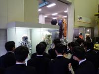 宇宙センターの概要説明を聞いた後、2グループに分かれてバックヤードツアーと「きぼう」運用管制室の見学を行いました。バックヤードツアーでは、宇宙服や地球に帰還したカプセル(実際に使用されたもの)を見ることができ、「きぼう」運用管制室では、それぞれの区画がどのような業務を行っているのか詳しく聞くことができました。