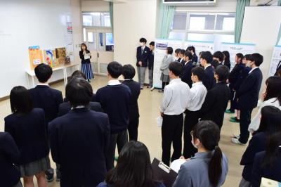 午前は、本校普通科探究班が考案したカードを用いた環境問題啓発ゲームを用いた交流会と研究発表会①(代表班による口頭発表)で、午後からは石川県立大学の勝見先生による講演会と研究発表会②(ポスターセッション)でした。