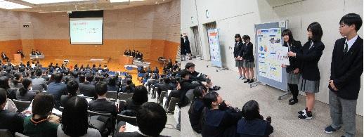 SSH・SGH合同研究発表会は1月24日(金)に開かれ、2年SGコースと理数科の生徒がこれまで取り組んできた課題研究の成果を発表しました。県内外の高校や大学等から約60人の教職員等が見学に来ていただきました。啓泉講堂での口頭発表では、生徒のほか、多くの参観者が見守る中、24Hと20Hの代表グループがプレゼンテーションを行うと、クラスをまたいで鋭い質問が飛び交い、白熱した時間となりました。続いて生徒は、ポスターセッションを行い、各グループの研究について参観者に堂々と臆することなく研究について語りました。様々な質問や意見を受けて、今後の研究の方針を見つめ直す良い機会となったようでした。
