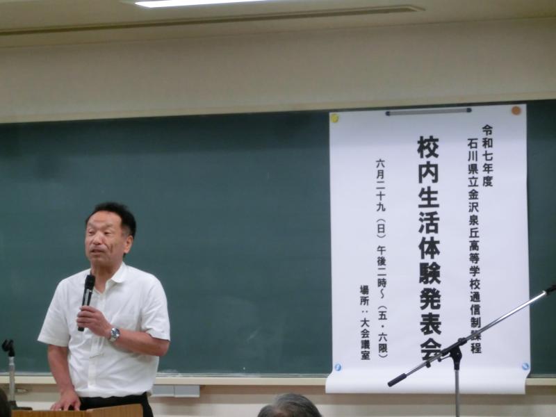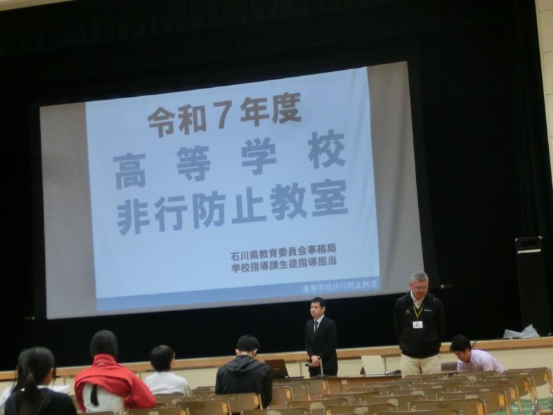 令和7年度非行防止教室が、金沢本校で18日(日)・19日(月)、七尾校で18日(日)に実施されました。金沢本校では、金沢中警察署、石川県教育委員会から講師を招き、闇バイトの恐ろしさ、スマホ、SNSが介在する凶悪犯罪など具体的な事例で説明がありました。県警生活安全課からは3つのポイント、1:わるいことはしない、2:あぶないことにちかづかない、3:かんがえてこうどうすることが伝えられました。続いて教育委員会からは、1:正しく使おうスマートフォン、2:オトナに相談することの二点について講演がありました。スマートフォンは便利で、なくてはならないものかもしれませんが、詐欺被害や凶悪事件が起きている現状をみれば、正しい知識を持ち、被害にあわないよう気を付ける必要があります。正しい行動をするための意識喚起につながる講演で、生徒は真剣な面持ちで聴いていました。