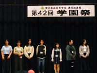 11月2日(日)本校啓泉講堂、各教室を使って標記学園祭をおこないました。啓泉講堂において、学校長から卓球、バドミントン競技の表彰伝達があり、活躍した選手をたたえました。これを励みにまた頑張ってほしいです。続いて、ステージ企画として、金沢工業大学軽音楽部のみなさんからJAZZが披露されました。講堂内はJAZZの雰囲気に包まれ、自然と体がスイングし、楽しい時間となりました。軽音楽部のみなさんありがとうございました。生徒有志のステージ発表、楽器演奏と続き演奏者は大舞台で演奏することの醍醐味を味わうことができたと思います。参加者全員が参加したビンゴゲームでもリーチやビンゴの声が飛びかいたいへん盛り上がりました。。賞品をGETできたみなさん良かったですね。生徒会のみなさん、楽しい企画をありがとうございました。
