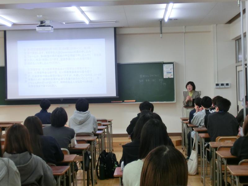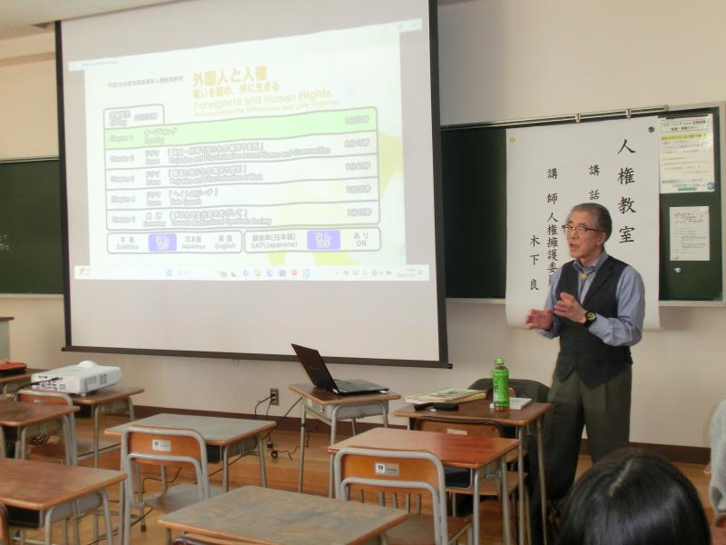 12月2日(月)5・6限、講師に司法書士・行政書士の資格を持つ、木下良氏をお招きして標記教室を実施しました。自己紹介とともに、司法書士など国家資格の説明の後、外国人への偏見、ヘイトスピーチが外国人に対する人権問題であることが紹介されました。同和問題の歴史を振り返ることで、平等であるあるはずの人間が差別されている事例の後、最後に、大谷選手やイチロー選手など世界で活躍する人物も、人権意識を強く持っていることが紹介されました。自身の経験を踏まえた講演内容で、人権が普遍的な価値をもつことや人権の本質を考える良い機会となりました。