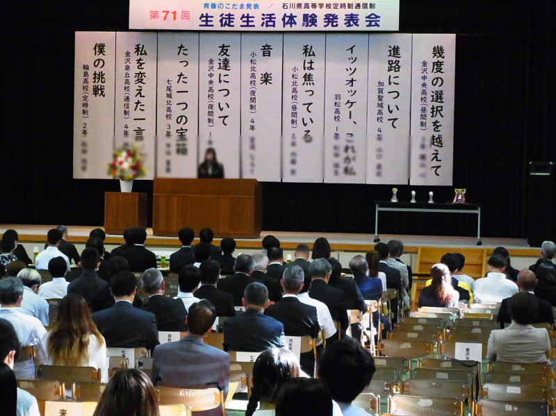 10月8日、本校啓泉講堂において、第70回石川県高等学校定時制通信制生徒生活体験発表会「青春のこだま」が開催され、県内の定時制・通信制高校から9名の代表が発表を行いました。悩んだり辛かったりした時期に自分や周囲の人々について感じたこと、現在の自分を見つめる中で考えること、将来への思い、など自らの経験から語られる言葉から多くの感動とエネルギーをもらいました。 本校2年の瑛哲さんは「拝啓、歩みを止めた貴方へ」のタイトルで、通信制への転学をきっかけに、自分で時間をコントロールし生活することの充実感、働くことを通じて得た社会の一員という実感が、今の自分を動かしていると語りました。そして、過去の自分と照らし合わせて、苦しんでいたり悩んでいたりする人に、「次の一歩」があることを伝えました。さんは石川県高等学校定時制通信制教育振興会優良賞を獲得しました。