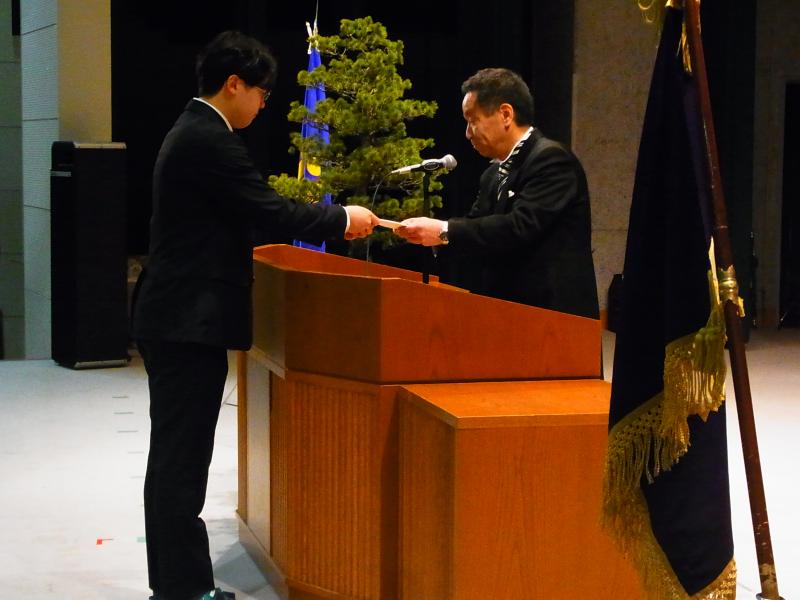 担任の呼名の後、左古亜里沙さんが卒業生163名の総代として証書を受け取りました。在校生代表として送辞を読んだ河岸侑来さんは、卒業生たちのあきらめない姿を称え、自分たちの手本となってくれたことへの感謝を伝えました。続いて、卒業生代表の辻英哲さんは、入学当時に不安を抱えていたけれど、通信制の生活を経て、自分の可能性に気づくことができたと答辞を述べました。