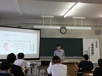 管理栄養士の神戸智美さんによる食育教室が行われました。神戸さんは本校の給食の栄養管理をされています。講義では、食品の栄養分類や自己管理の目安などをわかりやすくお話下さいました。良い生活習慣のキーワードとして「一無、二少、三多」(たばこは吸わない、腹八分、アルコールは少なく、体を動かす、ストレス解消、多くの人、事、物に接する)を最後にあげ、日常生活の改善につながるきっかけとなる行事になりました。
