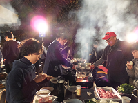 城北祭の2日目は毎年恒例のバーベキューです。全員で協力して準備をして、玄関前でバーベキューを行いました。男子がバーベキュー用の火起こしなどの準備をしている間に、女子は調理室で野菜のカットを行いました。おいしいお肉に舌鼓を打ち、自然と会話も弾み交流を深めることができました。振興会、同窓会、PTAの役員、卒業生も参加していただき大いに盛り上がりました。