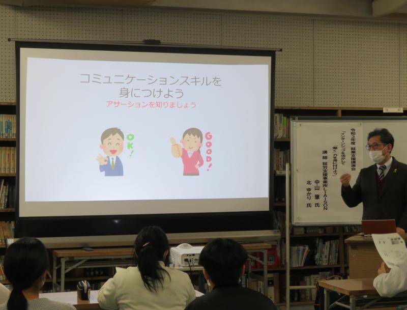12月17日(金)就労支援事業所LIAISON(リエゾン)から2名の講師をお招きし、進路講演会を開催しました。演題は『インターンシップを活かして働く力を身に付けよう』です。具体的には、①インターンシップ(実習・体験)の大切さについて知る、②気持ちの良い挨拶の仕方について、③「アサーション」でより良い人間関係を作る、という内容でした。講師の先生によるいくつかの場面を想定した「アサーション」のロールプレイは、とてもわかりやすく大変参考になりました。