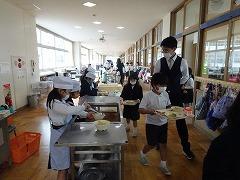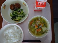 ↑今日のメニューは、ミルク食パン、メープルジャム、かぼちゃチーズフライ、キャベツのマリネ、スープ煮でした。金曜日はパン給食です。キャベツのマリネでは、春野菜のブロッコリーやキャベツをおいしくいただくことができました。