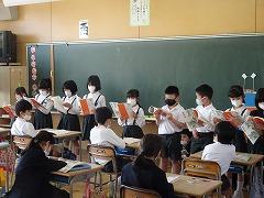 ↓4月の今月の歌は校歌でした。毎日歌い続けたので、1年生もとても上手に校歌を歌えるようになりました。音楽委員会さんも応援に来てくれました。