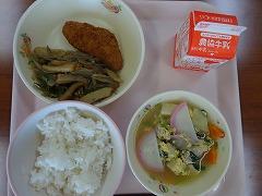 ↓今日の給食は、かつおフライ、きんぴらごぼう、高野豆腐の卵とじです。サクサクのかつおのフライに、かみかみメニューのきんぴらごぼう、彩のよいたくさんの食材が入っている卵とじです。1年生も小学校の給食を喜んでいただいています。
