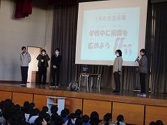 1月の生活目標は「出会った人にあいさつをしよう」、あいさつボランティアにも進んで参加し、元気に挨拶をしています。