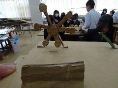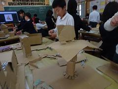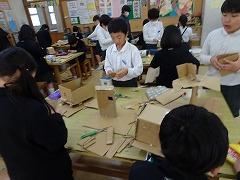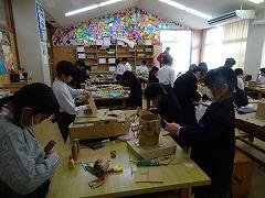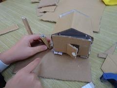 ↓4年生 図画工作 段ボールで建物を作っています。ドアや窓、風車も付けたりと、創造力を働かせて、自分の作品に工夫を凝らして作っていました。