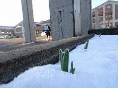 ↓1年生が新1年生のために植えたチューリップ、寒い冬を乗り越えて、芽を出しています。春は確実に近づいています。
