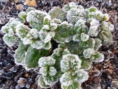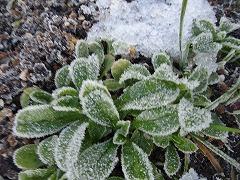 ↓放射冷却で冷え込んだ朝となりました。百葉箱の気温は0度で、植物には霜が降りています。寒い冬の日も、見守りをありがとうございます。