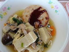 ↓今日の給食は能登地域の献立です。めぎすのから揚げ、打ち豆いりあいまぜ、中島菜のうどんじるでした。郷土料理を味わいました。
