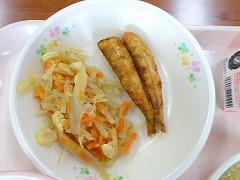 ↓今日の給食は能登地域の献立です。めぎすのから揚げ、打ち豆いりあいまぜ、中島菜のうどんじるでした。郷土料理を味わいました。