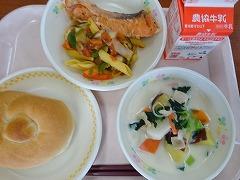 ↓全国学校給食週間、今日は河北郡市の献立です。かほくの恵みクリームスープ、鮭のハーブ焼き、ペンネとしいたけのトマトソースでした。いろどりがきれいで、しかも栄養たっぷりの地元メニューです。