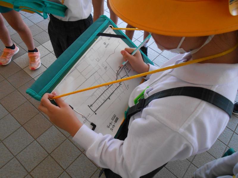社会では「学校のまわり」の学習で、学校の周りにあるものを探しに行きました。地図を基にメモを取りながらいろいろな発見ができました。学校の周りのひみつをたくさん見つけてくれそうです。