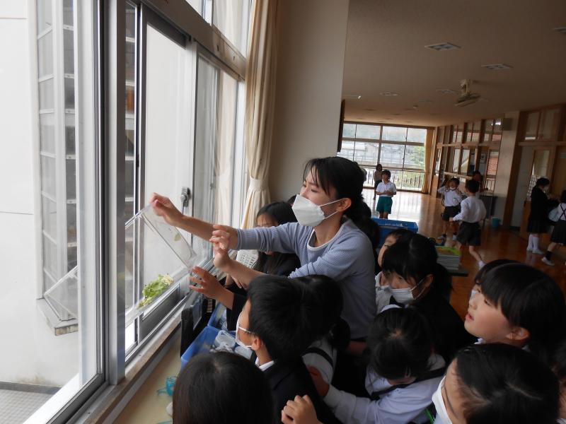 理科の学習で観察していたモンシロチョウの卵から成虫へと成長しました。虫かごの中では狭いので外へ逃がしました。