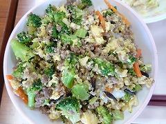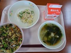 ↑全国学校給食週間 今日は加賀地域の献立です。ブロッコリーがたっぷり入った「そぼろっコリーご飯」、白菜のゆず風味サラダ、わかめスープでした。ブロッコリーと豚肉、牛肉、ツナ、ひじき、炒り卵等、食材がたくさん入ってうれしい「そぼろっコリー」でした。