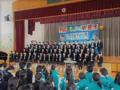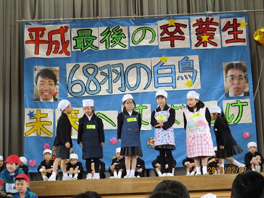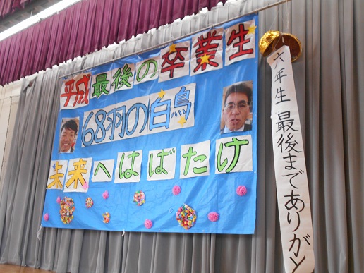 今年のテーマは「平成最後の卒業生 68羽の白鳥 未来へはばたけ」
