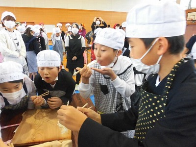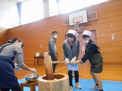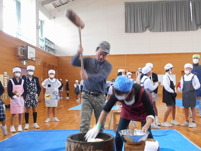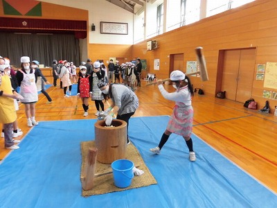 もちをつく,ちぎる,味付けをするなど貴重な体験をすることができました。もちをついている時や出来立てのもちを食べる時の笑顔はどても素敵でした。親子授業のもちつきは,大成功に終わりました。