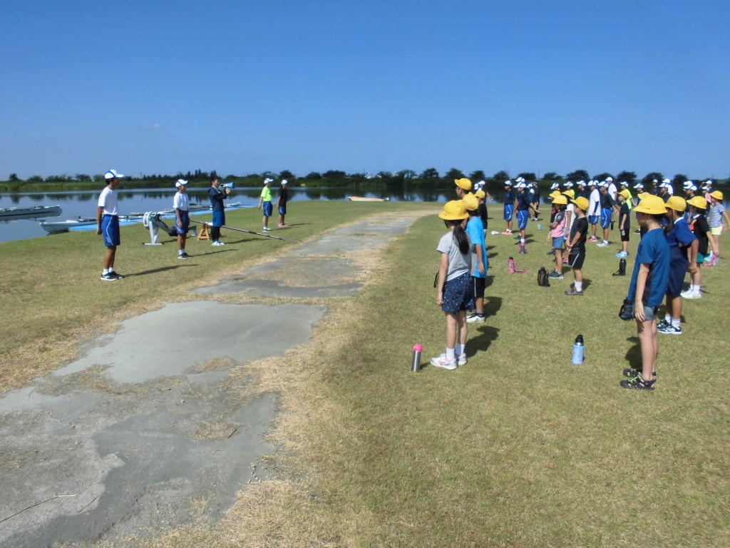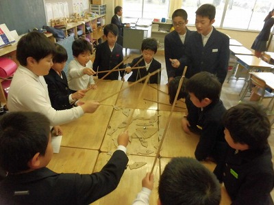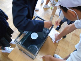 5年2組の児童は、今までの理科や総合の学習で川の流れや水害について学習してきたことをワークショップ形式で全校児童に伝えました。