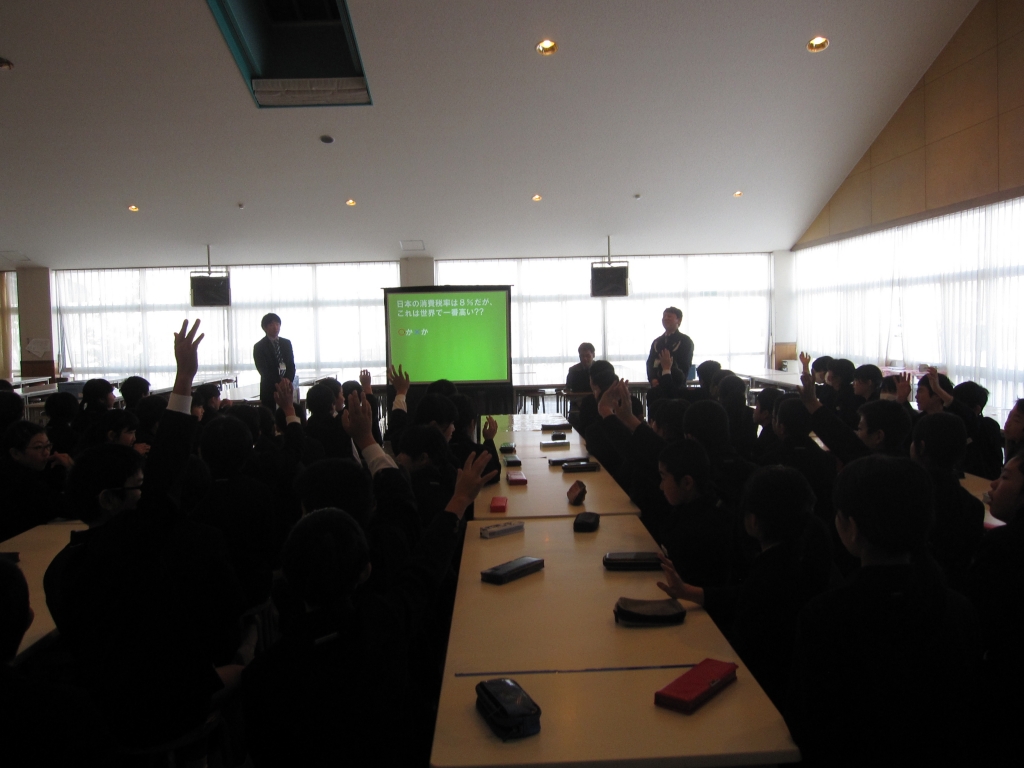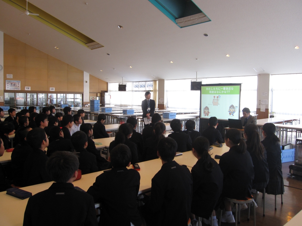 租税教室がありました。社会でも税金について学習していますが、今回は、津幡町役場の方々から教えていただきました。クイズなどもあって楽しみながら学ぶことができました。