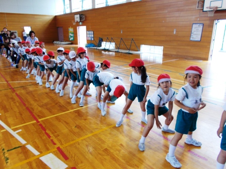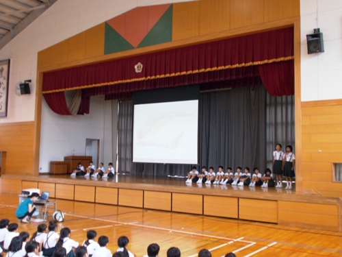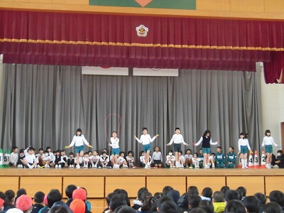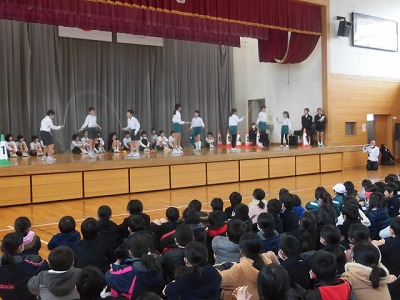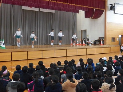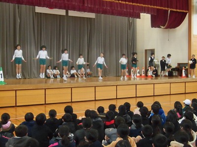 今まで練習してきた縄跳び技を全校の前で披露しました。