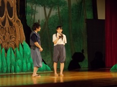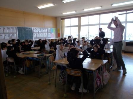 3びきのこぶたのお話をおもしろおかしいお話に変えて、6年生を喜ばせました。