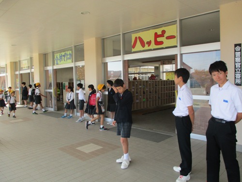 中学生も今条南小学校で行っている「あいさつ貯金」に参加をしてくれて,素敵なあいさつをした子ども達に「おはチケ」を渡していました。