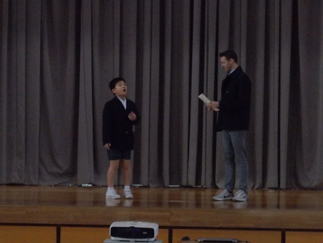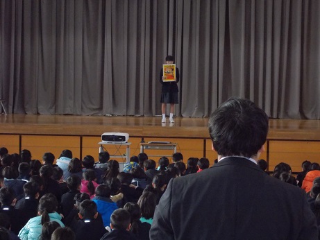 最後の英語スピーチコンテストの校内発表会では,代表となった5,6年生の児童が練習してきた成果を披露してくれました。全校の前で緊張していましたが,発音やジェスチャー,表情など,堂々とスピーチをしてとても立派でした。本番までもう少し練習を積み重ね,完成度を高めていきたいと思います。