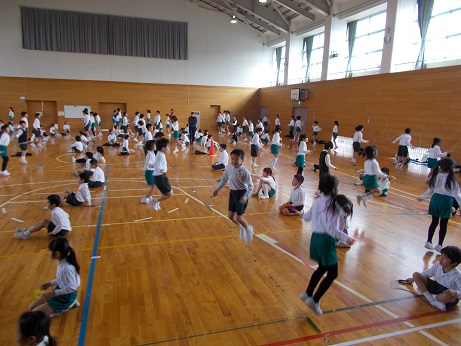 月曜日は6・1年生、水曜日は2・5年生、金曜日は3・4年生が2分間で前とびを何回跳べるかチャレンジします。