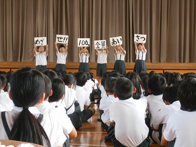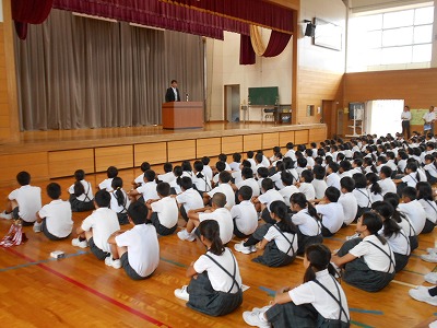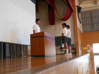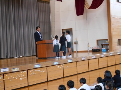 今月は,郡市の読書感想文や図画作品展,書写作品展,マラソン大会などの表彰がたくさんありました。子ども達の多くの頑張りを全校で称えました。代表の児童は,堂々と校長先生から賞状を受け取っていました。