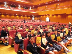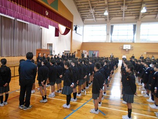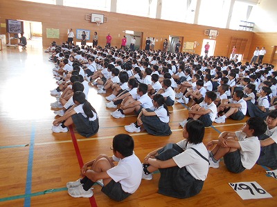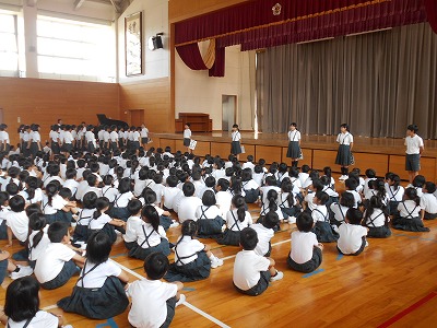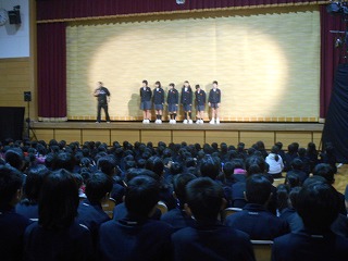 今月の歌では,「きみに会えて」を全校合唱しました。それぞれの学年のパートがきれいに重なり合い,素敵な歌声が体育館に響き渡っていました。