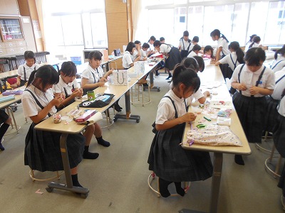 手芸クラブでは,クッション作りが完成に近づいていました。針と糸の使い方が上手!