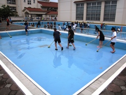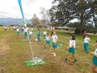 次は,「バルーンロケット」。水と空気を入れ,天高くペットボトルロケットを発射。一番高く飛ぶグループを競い合いました。