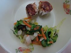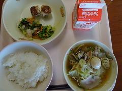 ↓今日の給食はちゃんぽん麺で、ウズラの卵入りです。シュウマイと白菜の昆布和えもいただきました。