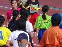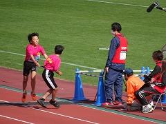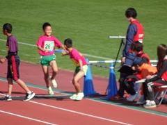 ↓第3走者にタスキが渡されます。5年生ですが、力強い走りです。途中抜かされましたが、抜き返してメインスタンドに入ってきました。ものすごい根性です。