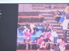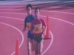 ↑大型テレビにも、条南っ子のトップ争いの様子が大きく映し出されていました。上手にタスキを渡します。第3走者から第4走者にタスキが渡ります。力強くスピードを上げていきます。