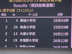 10:30からは男子の部のスタートです。第1走者がスタートしました。トップを走っているのが条南小チームです。大型テレビで、終始条南小のトップランナーが映し出されていました。昨年の区間1位よりも速いタイムでゴールしたそうです。