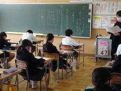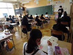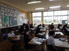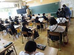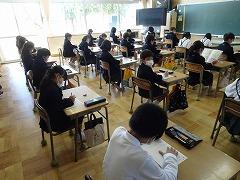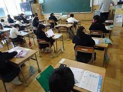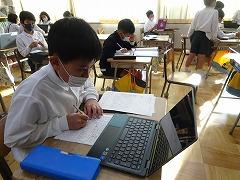↑今日の朝学習は漢字練習です、筆順や部首、熟語など、全校で指導法を統一しました。下敷きを敷いて、美しく書いています。