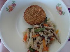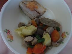 ↓今日の給食は、魚の紅葉ソースで、さごし(さわら)の上ににんじんと柚子と大根を使ったソースがかかっていました。季節感を演出してあるメニューでした。秋の吹き寄せ煮には、鶏肉、高野豆腐、こんにゃく、ごぼう、いんげんにさつまいもが彩りよく煮てありました。たくさんの食材をいただくことができました。じゃがいもの味噌汁には、じゃがいもの他、にんじん、たまねぎ、えのきも入っていました。体にやさしい和食メニューでした。