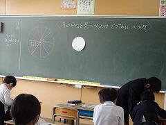↓3の3 円の中心はどのようにして見つけたらよいかな。実際に円を切り取って、中心の見つけ方を考えました。どのようにして見つけたか、ペアで説明し合いました。
