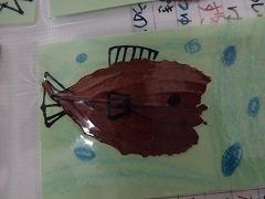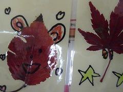 ↓1年 きれいな葉っぱで秋のしおりが出来上がりました。創造力を働かせ、とってもかわいいしおりにできあがりました。